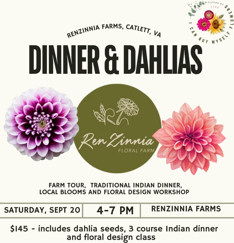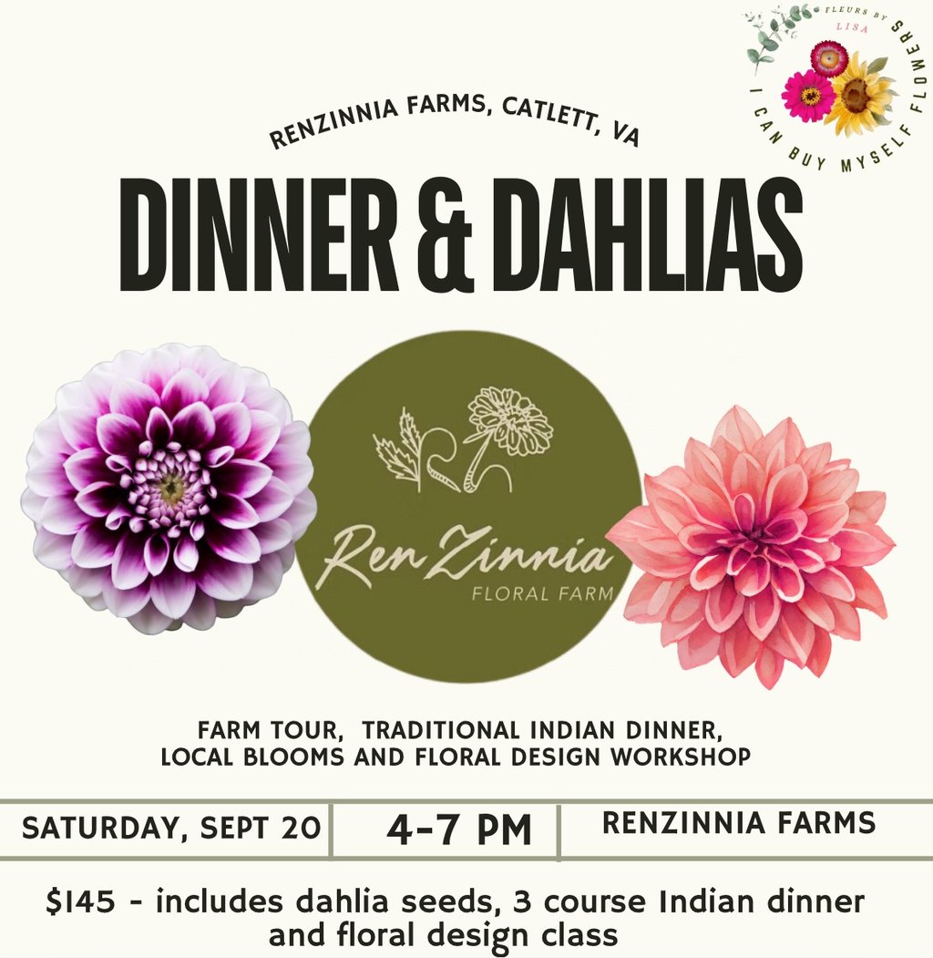 Join us at Renzinnia Farm for an evening of calm, romance and beauty. Paired with a floral design class, participants will tour the farm and enjoy a 3-course Indian dinner.