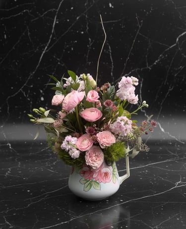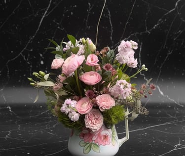 Larger monthly Designer's Choice arrangement in vintage container $125/month (Lisa swaps out the vintage container each month so you always get a new look)