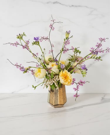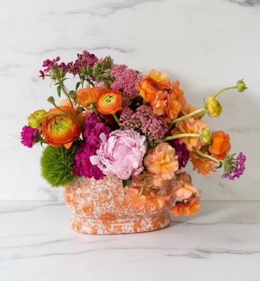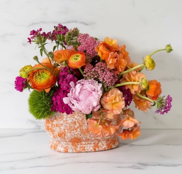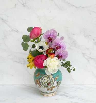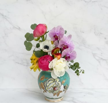 Lisa's designs are ikebana in style - simple, elegant and always unique. Each design will be curated with a container and flowers that complement it. If you have a certain flower or color palette in mind, be sure to mention it in your order form! Lisa uses local blooms whenever possible and her arrangements are foam-free and environmentally-friendly.