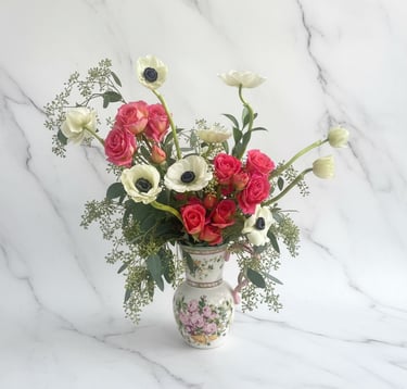 Medium size monthly Designer's Choice arrangement in vintage container $75/month (Lisa swaps out the vintage container each month so you always get a new look)